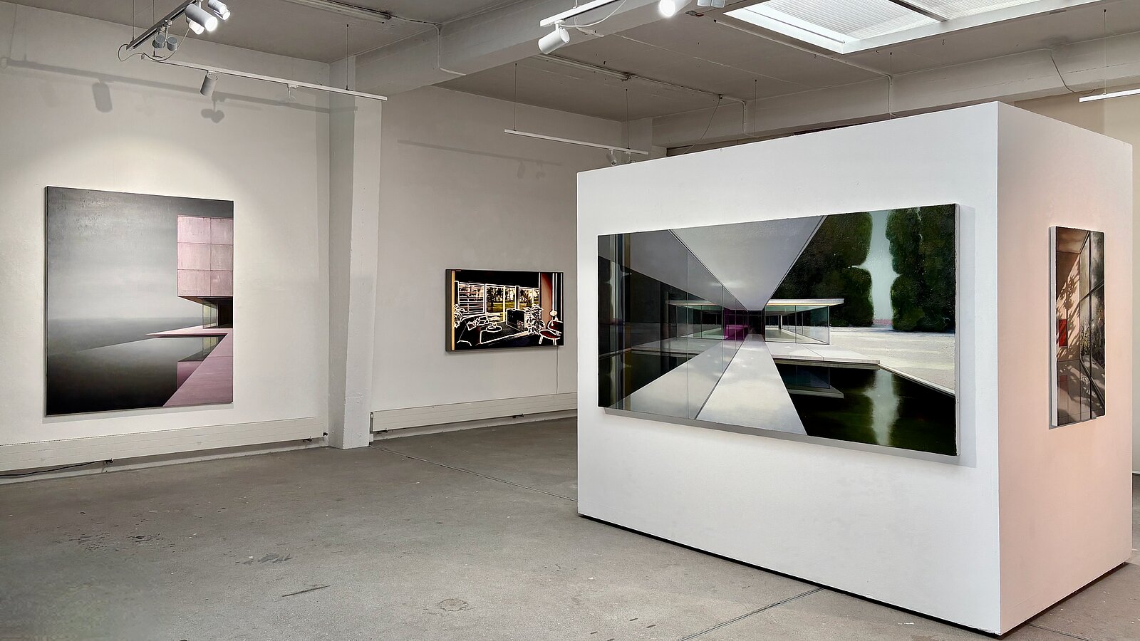 Kennzeichnend für die Arbeiten von JENS HAUSMANN sind ebenfalls menschenleere Szenen, in denen die Abwesenheit der Bewohner eine geheimnisvolle, Atmosphäre erzeugt. Auch bei ihm bleiben Spuren menschlicher Präsenz weiterhin sichtbar und Natur und Pflanzen scheinen ein Eigenleben neben und mit der Architektur zu führen. Die Gebäude basieren meist auf realer Architektur, werden jedoch malerisch verzerrt, perspektivisch überdreht und zu einer konstruierten Realität verdichtet. Licht, kubische Formen und brillante Farbigkeit lassen dramatische, nahezu theatralische Bildräume entstehen. Dabei stehen Stofflichkeit und Materialität der Darstellung neben der geometrischen Abstraktion im Fokus des Malers.